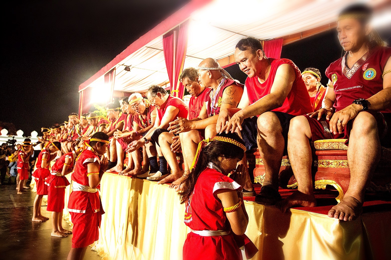 - À 17h30, procession du maître de cérémonie, suivi des maîtres de muay thai et des boxeurs vers le pavillon cérémoniel.