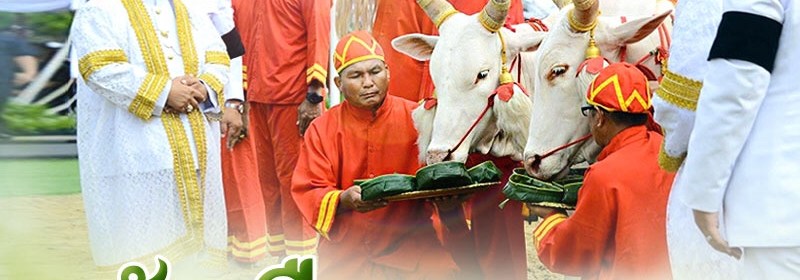 - Deux bœufs sacrés sont attachés à une charrue en bois pendant que le roi trace dans la terre trois sillons représentant une rivière sacrée. Les bœufs de l’attelage royal vont prédire l’avenir des récoltes.