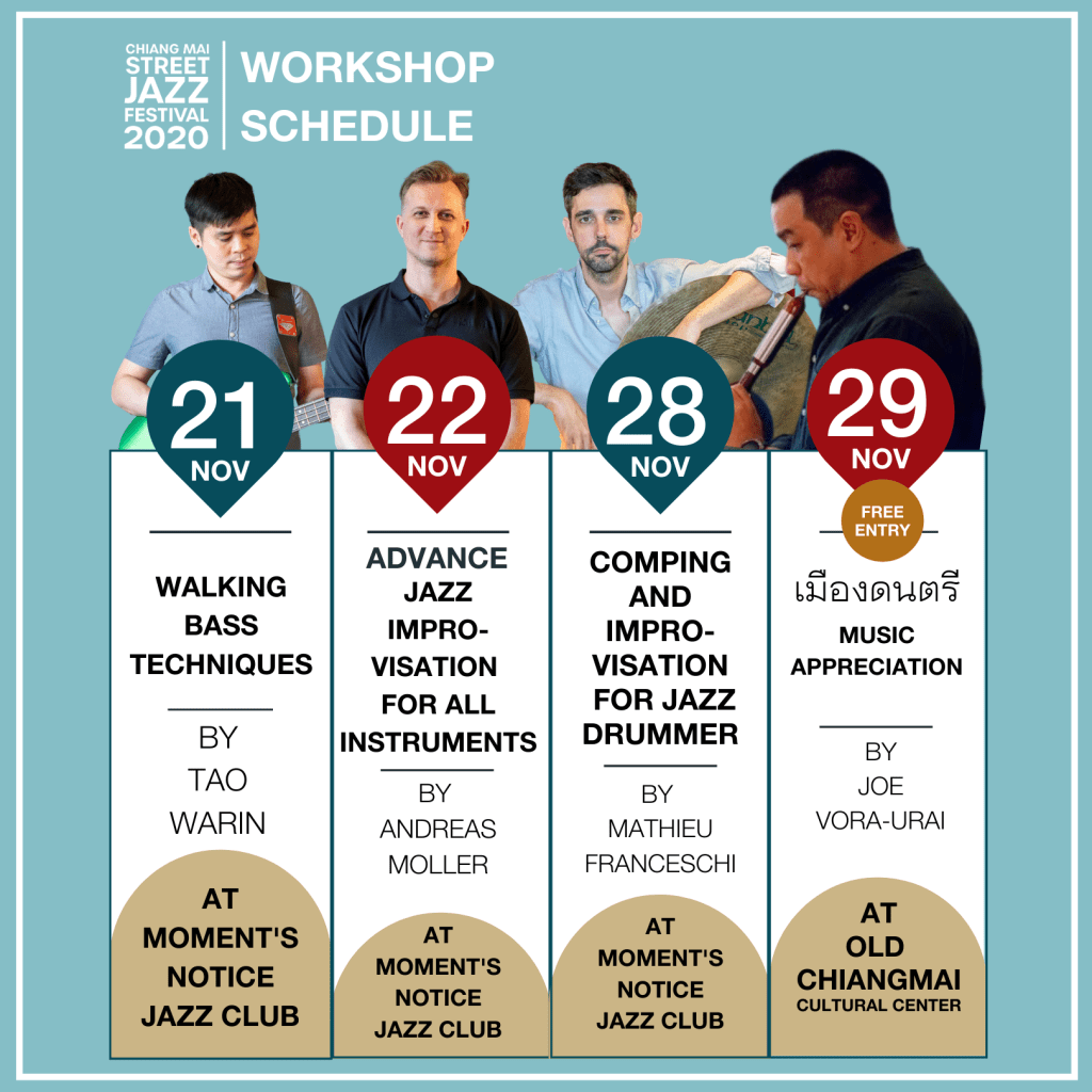 - Samedi 21.11.2020 au Moment’s Notice. Thème : techniques de walking bass (en thaï uniquement). Un atelier animé par Warin Tatun, bassiste et propriétaire du club de jazz Moment’s Notice.