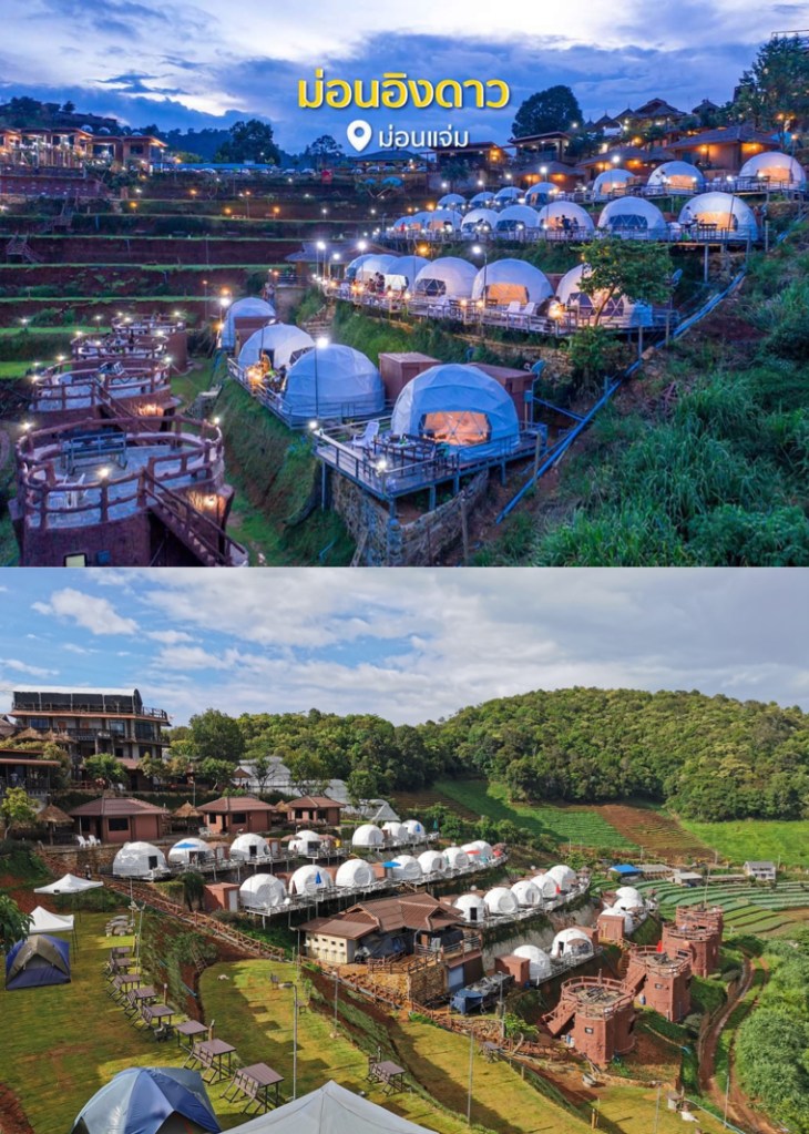 Moningdao Resort (ม่อนอิงดาว). Leur page Facebook et leur site web. Pas encore d’avis sur TripAdvisor. Et là aussi vous devrez les contacter pour réserver car la réservation via Booking n’est pas fonctionnelle. Soit via Messenger, soit via leur adresse Email, soit via Line, soit encore en leur téléphonant (+66 86 216 7405 et +66 89 952 0202). Ou alors vous rendre sur place (attention, le week-end, le coin est pris d’assaut).