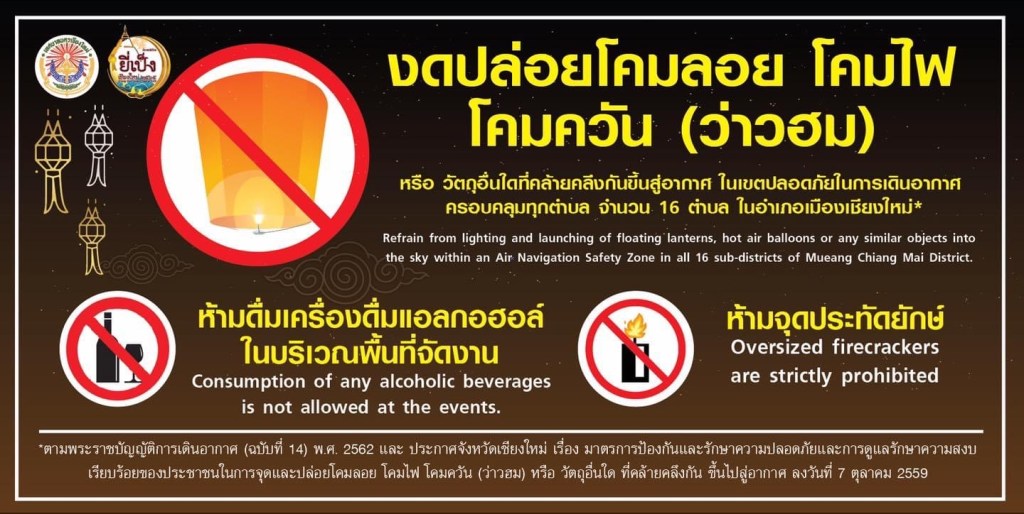 Ces lâchers de lanternes célestes sont strictement réglementés. Pour des raisons de sécurité liées à l’aéroport de Chiang Mai, il est interdit de lâcher des lanternes célestes dans 8 districts, comprenant la ville de Chiang Mai et ses alentours (soit toute sa périphérie). Et encore, les lieux des districts à l’extérieur de la ville où vous pourrez lâcher votre lanterne céleste sont eux aussi réglementés, c’est dire qu’il vous faudra suivre les instructions des autorités locales. Et ne vous avisez pas à enfreindre ces restrictions car il y a des amendes à la clef (jusqu’à THB 200’000.-), sans parler de l’emprisonnement (jusqu’à 5 ans, voire 7 si votre lanterne devait causer un incendie). Vous pourrez donc lâcher votre lanterne céleste dans les lieux autorisés le lundi 27 novembre, de 10h à midi, et surtout le mardi 28 novembre 2023, de 19h à 1h du matin.