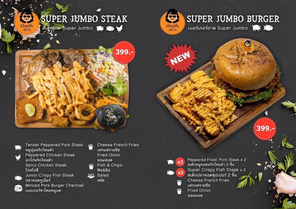 Son Super Jumbo Burger – sa marque de fabrique – est vendu au prix de THB 399.- (seulement, serait-on tenté d’écrire), soit à peine € 11.-. Pour ce même prix, d’autres clients optent pour un plat comprenant quatre viandes différentes, le Super Jumbo Steak. L’oncle Yik promet d’utiliser des produits frais et de qualité, le tout avec une hygiène irréprochable. Super jumbo ? Les photos publiées vous en donnent une idée.