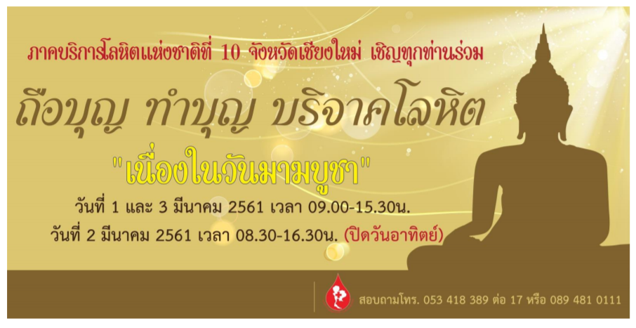 En Thaïlande, faire tham bun c’est faire le bien pour acquérir des mérites dans le cycle des réincarnations. Cette acquisition des mérites, un concept cher aux Thaïlandais2, passe également par des bonnes actions comme le don de sang. Ainsi, durant la fête de makhabucha 2021, les habitants de Chiang Mai sont particulièrement invités à donner leur sang le 26 février, de 8h30 à 15h30, au centre de récolte sanguine de la Croix-Rouge (ภาคบริการโลหิตแห่งชาติที่ 10 จังหวัดเชียงใหม่, Red Cross Blood Donations, à côté du complexe nocturne Zoe in Yellow). Le personnel de la faculté de médecine de l’université de Chiang Mai (CMU) vous le demande en vidéo.