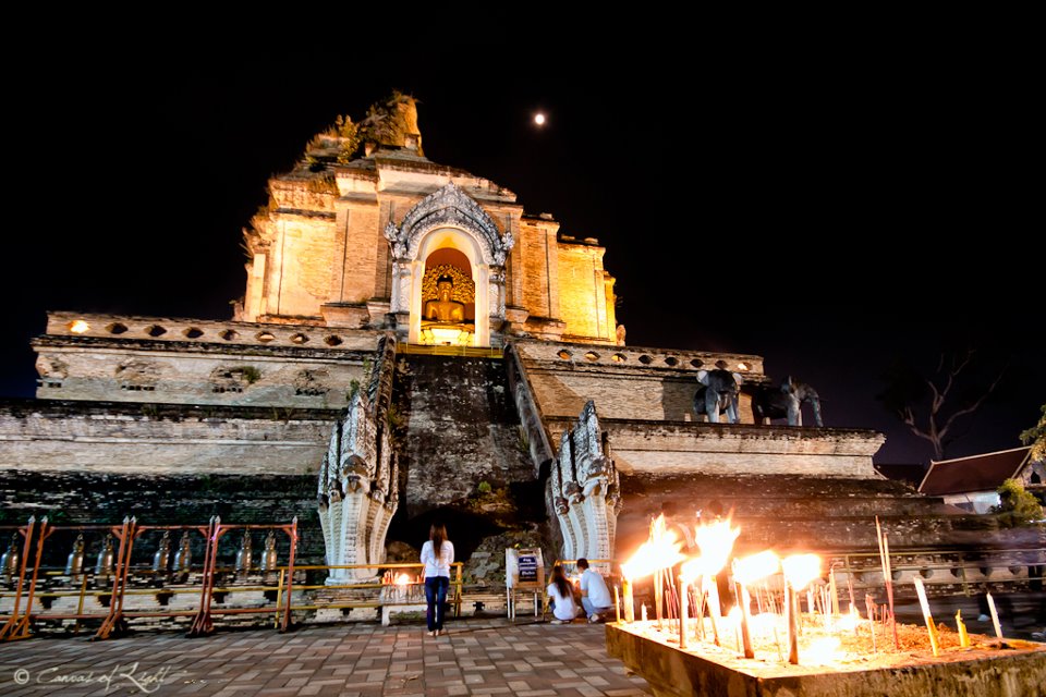 Le Wat Chedi Luang Worawihan (วัดเจดีย์หลวง, dont l’entrée est gratuite à cette occasion); c’est là que vous retrouverez une ambiance authentique empreinte de religiosité. Un sermon est donné à 9h du matin et la procession illuminée a lieu dès 19h. Un des temples où nous vous conseillons très fortement de vous rendre pour vivre cette célébration. De notre point de vue, le Wat Chedi Luang se doit impérativement d’être visité lors de votre venue à Chiang Mai, idéalement une fois la nuit tombée.