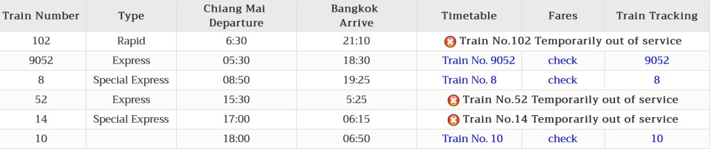 Dans le sens contraire, soit la liaison Chiang Mai – Bangkok, ce sont là aussi trois liaisons quotidiennes qui sont assurées. Au train diurne Express no 9052 déjà fonctionnel (départ de Chiang Mai à 5h30, arrivée prévue à Bangkok à 18h30), s’ajouteront deux trains :
