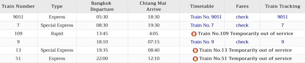 • Ligne du nord (c’est celle qui nous intéresse) : 2 trains (aller-retour) sur la ligne Bangkok-Chiang Mai.