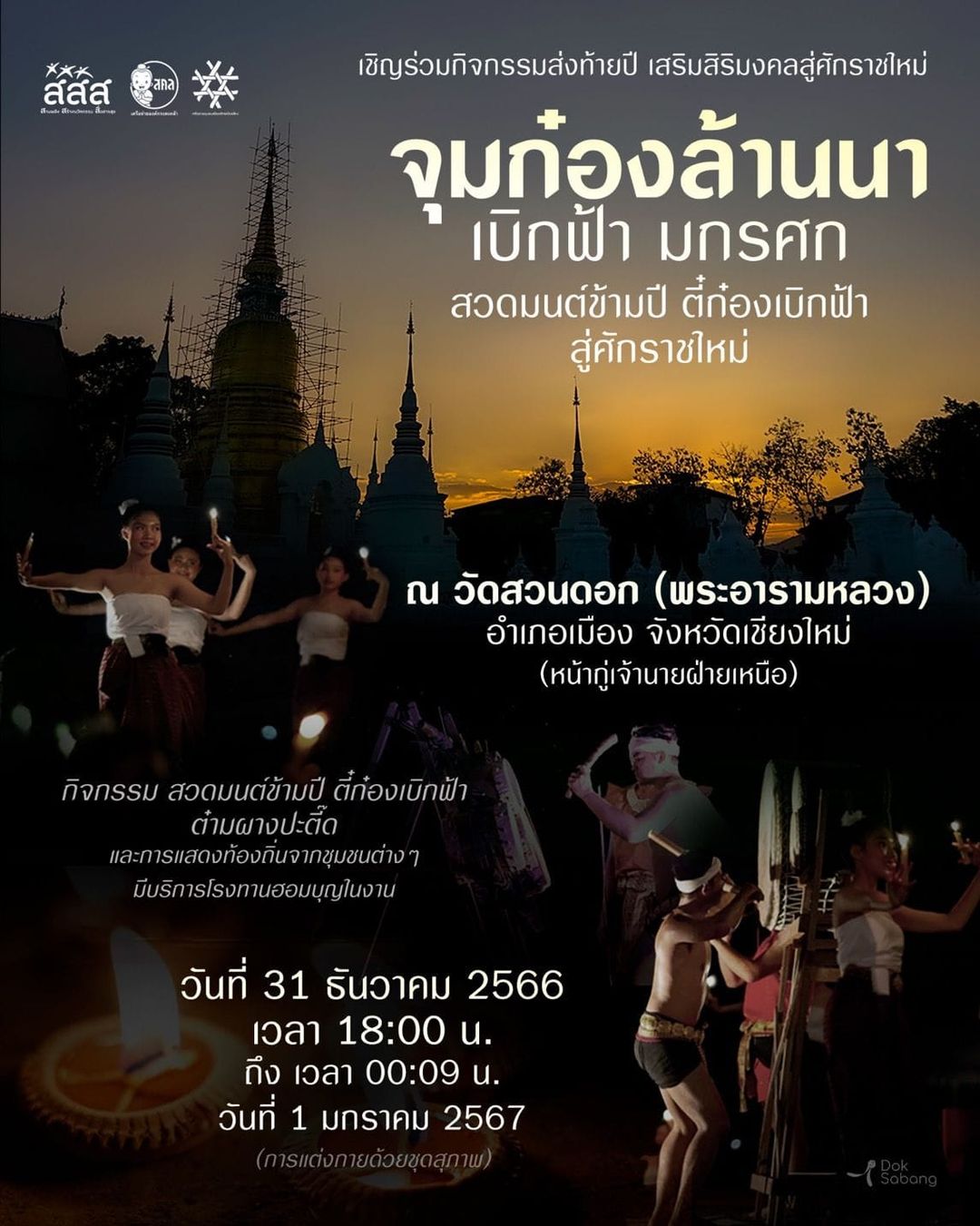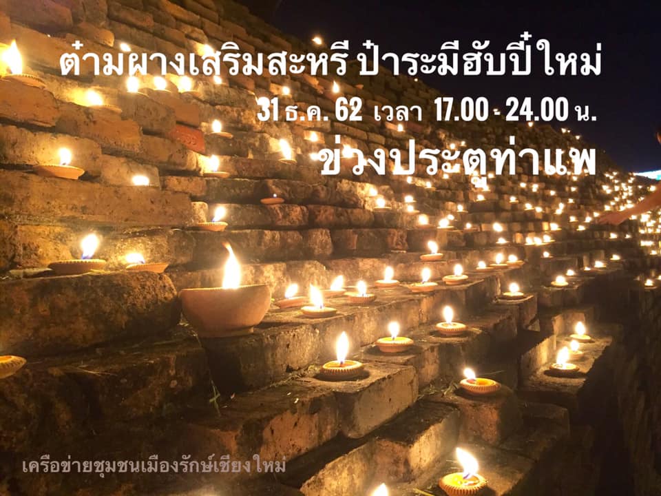 Jum Kong Lanna (จุมก๋องล้านนา), c’est sans nul doute là la cérémonie qui devrait plaire à tout touriste occidental désireux de découvrir la richesse de la culture lanna, la culture du Nord thaïlandais. Un compte à rebours dans le plus pur style lanna vous est proposé au Wat Suan Dok (วัดสวนดอก), à l’ouest du « carré », ici. Organisé par le réseau communautaire Muang Rak Chiang Mai, les prières se feront au rythme des tambours du Lanna. Il y aura là de somptueuses performance artistiques et culturelles, dont un spectacle d’art folklorique, de même que des danses traditionnelles, avec de la cuisine typique du Nord.