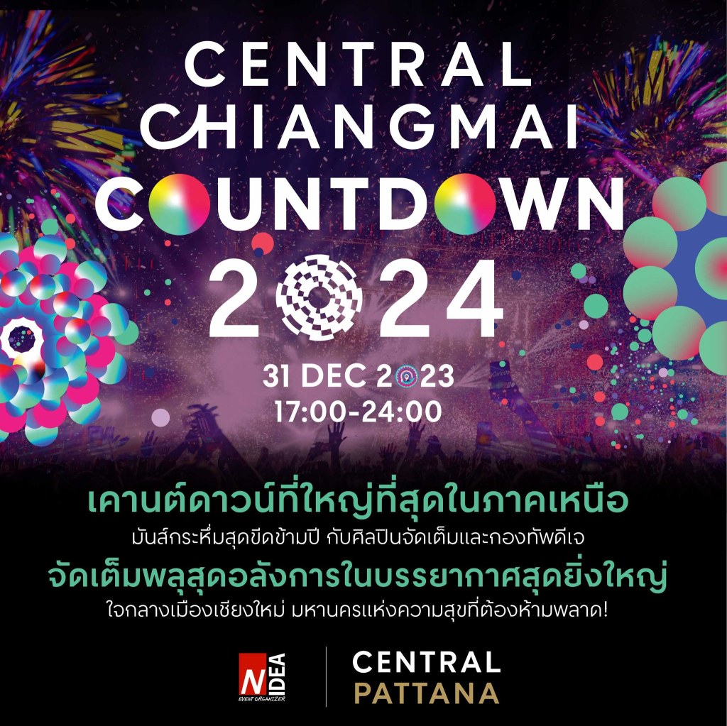 Central Chiangmai Countdown 2024 au centre commercial Central Chiangmai (เซ็นทรัล เชียงใหม่), ici (l’ancien Central Festival). De 17h à minuit passé, 4 concerts d’artistes nationaux et une armée de DJ animera la soirée. Ce sera là l’événement qui aimantera la jeunesse de Chiang Mai et au-delà ce dimanche 31 décembre 2023. Une des raisons majeures est que l’événement est ฟรี (fri, gratuit) 😁