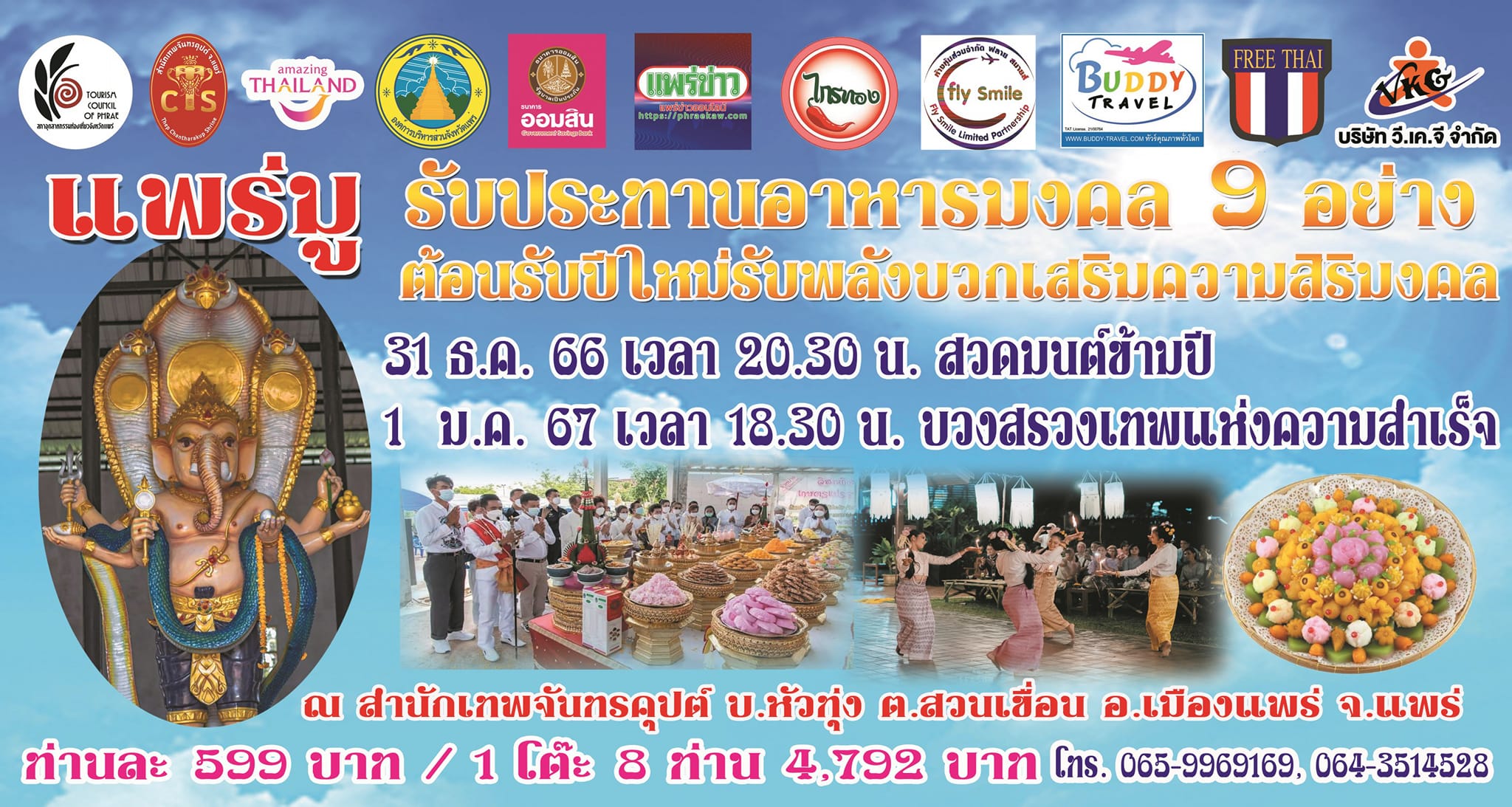 Puisque nous évoquons principalement les événements organisés à Chiang Mai et dans le Nord thaïlandais, mettons à l’honneur cette cérémonie organisée au temple dédié à Ganesh, le musée Thep Chandrakupt (เทวสถานพระพิฆเนศวร สำนักเทพจันทรคุปต์), dans la province de Phrae, ici. La cérémonie est appelé Phrae Mu (แพร่มู). Elle comprend des prières pour la nouvelle année, l’allumage de bougies destiné à attirer fortune et richesse, la distribution d’objets sacrés, un repas de 9 mets de bon augure, en profitant d’un spectacle. Cela a lieu en deux phases, le dimanche 31 décembre 2023, dès 20h30, et le lundi 1er janvier 2024, dès 18h30. Tout est expliqué, en thaï bien sûr, sur la page Facebook du musée, un écrin entouré de rizières.