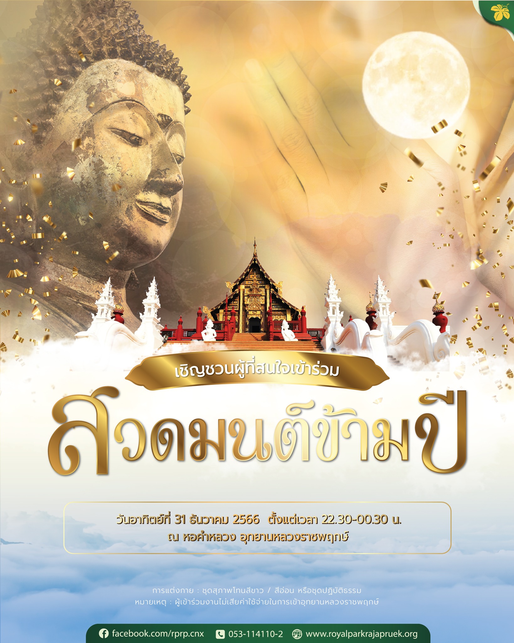 L’on vous donne rendez-vous le dimanche 31 décembre 2023, dès 18h. L’événement culturel dure jusqu’à minuit 09 le lundi 1er janvier 2024. Ensuite, les offrandes matinales se feront en présence de 299 moines bouddhistes (lundi matin dès 6h30). Habillez-vous idéalement avec des couleurs claires; les dévots pratiquant le Dhamma porteront des vêtements blancs.